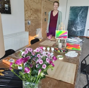 De tijd vliegt voorbij, na het schilderen kijken we samen wat er is ontstaan op het doek. Je brengt de unieke betekenis van het werk onder woorden.
